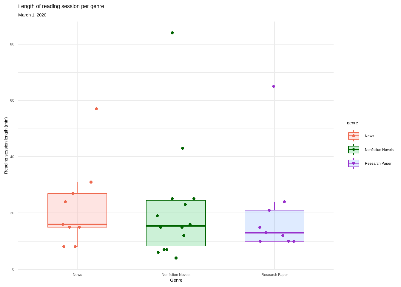 Figure 1. There is no difference in length of reading session across genre. Each genre contains a box plot displaying the median reading length, upper and lower quartiles, and minimum and maximum. Outliers are hidden for visual clarity but each genre’s highest point is classified as an outlier. Individual observations are layered on as data points. Genres are separated by color (pink: News, green: Nonfiction Novels, purple: Research Paper). All genres overlap with nearly identical medians. Data collected from January 6, 2026 to March 1, 2026 by Ian Del Tredici.