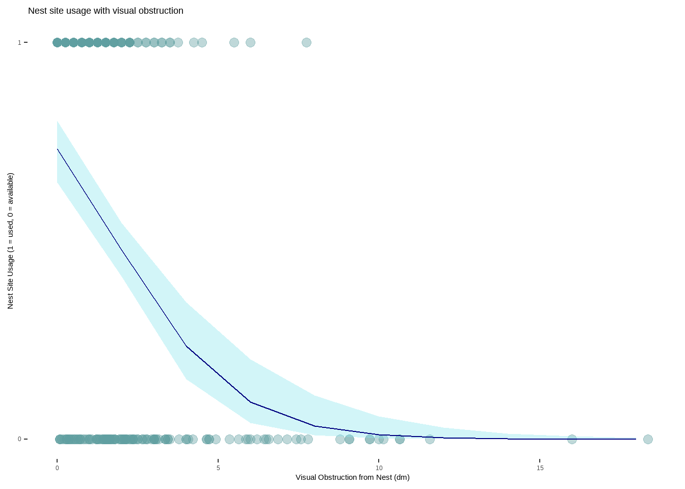 Figure 1. As visual obstruction at the nest site increases, the probability of nest site usage decreases. Each teal-colored point represents an individual nest that was assessed. The blue line represents the probability of a nest site being used as visual obstruction increases in distance (1 = 100%, 0 = 0%). The light blue shaded area around the line is a 95% confidence interval. Nest site usage is portrayed as a binomial variable with 1 being a used nest and 0 representing an available nest. Data from: Duchardt, Courtney; Beck, Jeffrey; Augustine, David (2020). Mountain Plover habitat selection and nest survival in relation to weather variability and spatial attributes of Black-tailed Prairie Dog disturbance [Dataset]. Dryad. https://doi.org/10.5061/dryad.ttdz08kt7