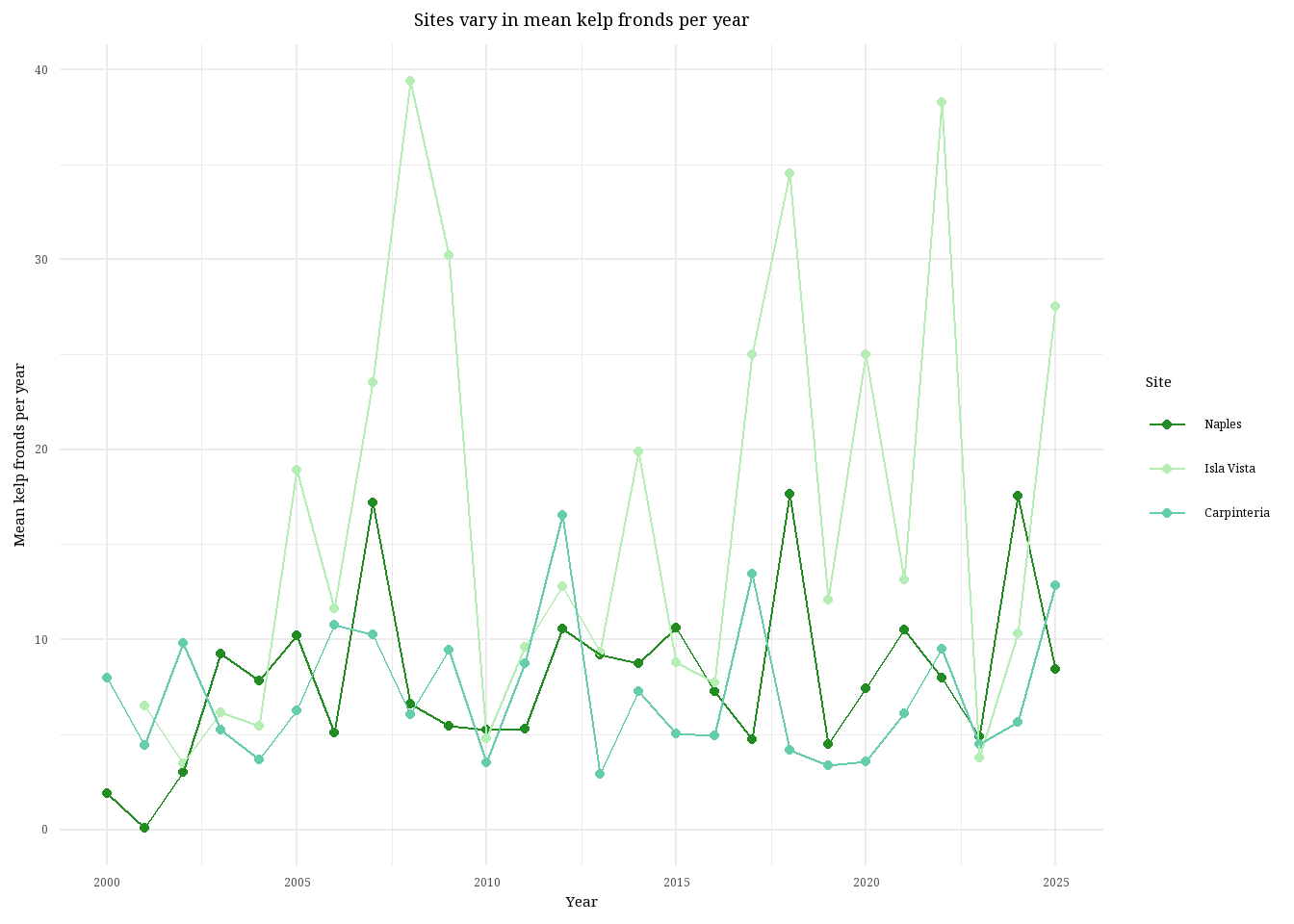 Isla Vista is the site with the most variable mean kelp fronds per year because you can see the line connecting the data points stretching all the way up to nearly 40 kelp fronds and then back down to below 10. Visually, you can see the data line for Isla Vista dance all over the graph, the data points are farther apart and less consistent than the other two sites. Carpinteria is the site with the least variable mean kelp fronds per year, visually identifiable because the data points are more consistent and the overall trend of the line does not exhibit massive swings in kelp fronds. The line remains just below or around 10 kelp fronds per year for nearly 25 years.